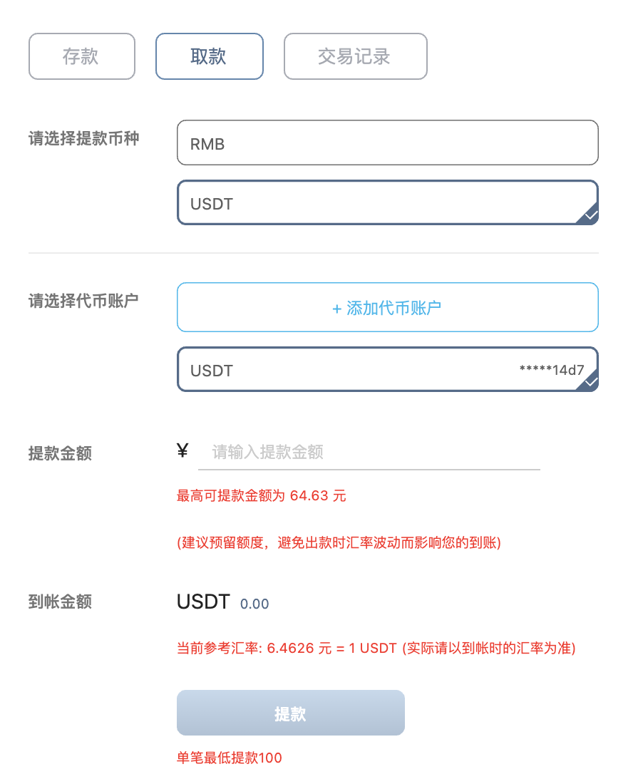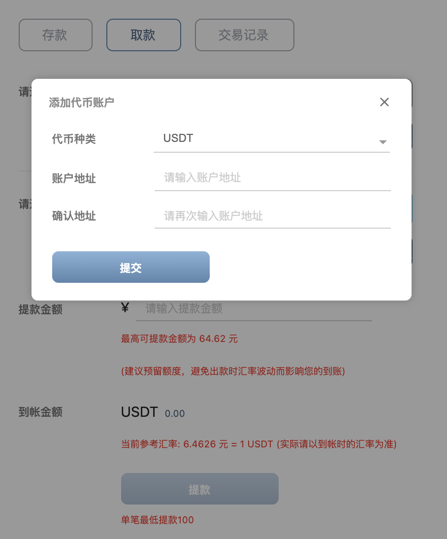 2.提款申请:提款币种选择USDT->选择账户地址->提款金额输入人民币金额,则到账金额会根据当前参考汇率转换成USDT->输入提款密码->提交